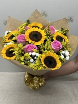 Um buquê que carrega a força do amor e o calor da luz. As rosas vermelhas traduzem paixão e sentimento profundo, enquanto os girassóis irradiam alegria, energia e esperança. As flores silvestres de tango e aster adicionam leveza e textura, completando essa composição vibrante e afetiva. Tudo embalado com papel kraft em estilo romântico, que valoriza o contraste das cores e o charme natural do arranjo. Ideal para declarar, agradecer ou simplesmente iluminar o dia de alguém especial.