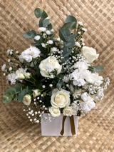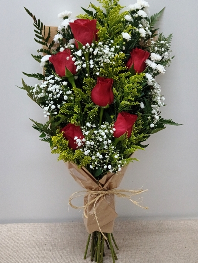 Com 6 rosas vermelhas de beleza intensa, este buquê em formato leque encanta pela simplicidade sofisticada. As folhagens de tango e aster, junto às delicadas porções de gypsophila, criam volume, leveza e um toque silvestre que valoriza ainda mais o arranjo. A finalização com papel kraft traz um ar romântico e artesanal, perfeito para surpreender com um gesto elegante, simbólico e cheio de sentimento.