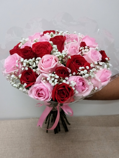 Este buquê ramalhete é um verdadeiro espetáculo de sentimentos. Com 24 rosas cuidadosamente dispostas — mesclando o vermelho da paixão e o rosa da ternura —, o buquê exala emoção e beleza em cada detalhe. As delicadas flores de gypsophila, conhecidas como "mosquitinho", trazem um toque etéreo e encantador, suavizando a composição com elegância. Ideal para demonstrar afeto profundo, surpreender em datas especiais ou transformar qualquer dia em uma lembrança inesquecível.
