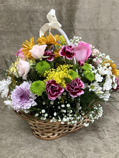 Um arranjo que celebra a beleza natural com leveza e alegria. Em tons coloridos e suaves, essa composição reúne flores do campo, rosas e mini rosas em perfeita harmonia com folhagens frescas e delicadas, tudo apresentado em uma cesta de vime que reforça o toque rústico e acolhedor da criação. Ideal para presentear com ternura, surpreender com simplicidade encantadora ou levar cor e vida a qualquer ambiente com elegância e afeto.